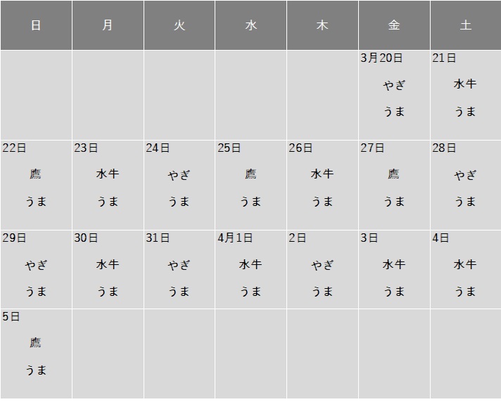 | 開催期間 | 【3月】17日、18日、20日、22日、24日、25日、27日、29日、31日 【4月】1日、3日、5日 |