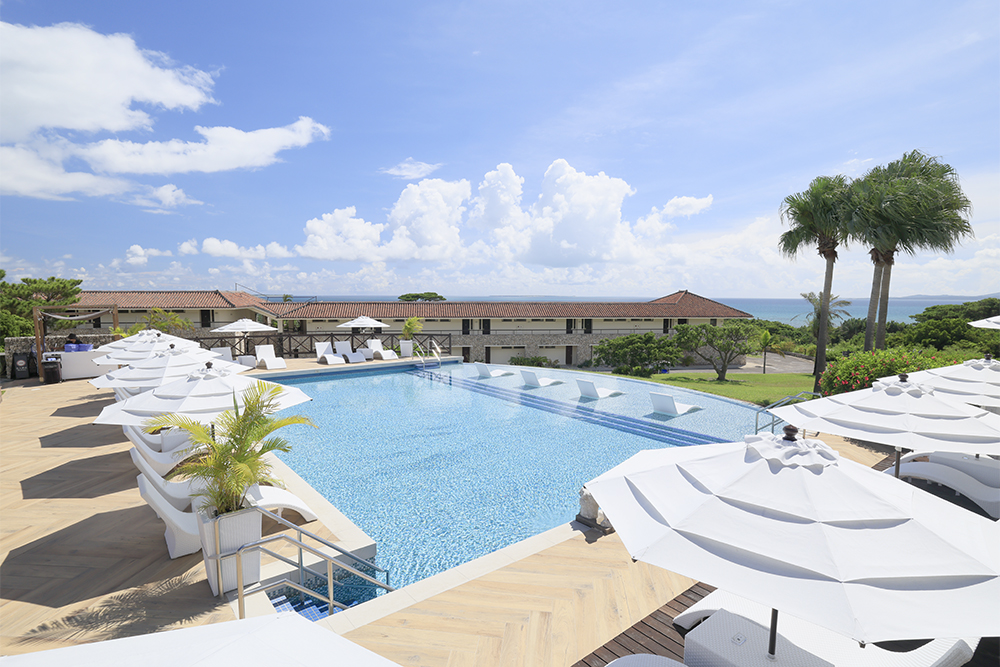 沖縄離島初 ビーチの波打ち際に近接した約330 ㎡の2 段の「Main Pool(メインプール)」を新設。海と繋がるような感覚をお楽しみいただける2 段のインフィニティメインプール。